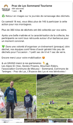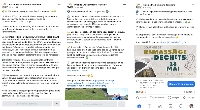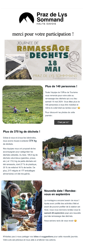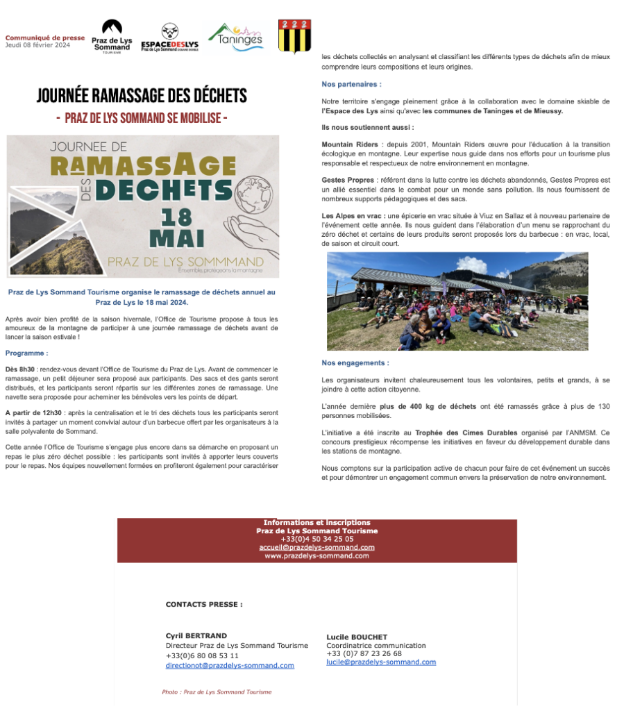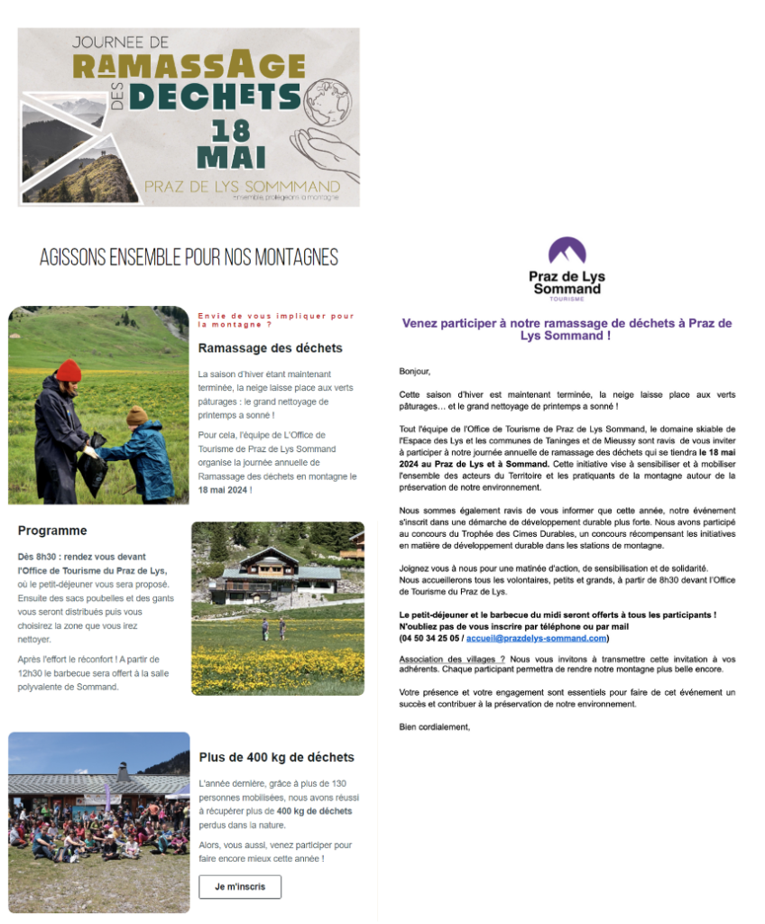 Ma mission principale a été de prendre en charge intégralement la communication de l’événement de ramassage des déchets qui a eu lieu le 18 mai 2024 à Praz de Lys Sommand. J’ai élaboré un plan de communication et un calendrier éditorial pour mener a bien cette mission. Voici quelques visuels pour vous donner une idée de ce que j’ai pu réaliser. Par exemple un communiqué de presse, des campagnes d’e-mailing, des posts sur les réseaux sociaux, un after movies…